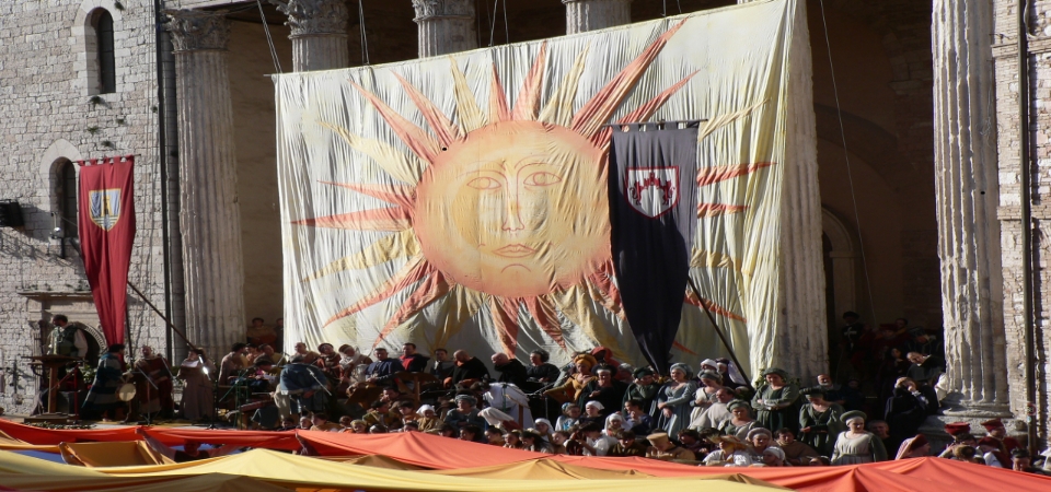 Le origini del Calendimaggio si perdono nel tempo, si riallacciano, a consuetudini pagane che celebravano con riti diversi ma tutti improntati alla gioia, il ritorno della primavera e quindi il rinnovarsi del ciclo della vita. Erano manifestazioni nate dal sentimento dell’antico popolo degli Umbri. Lo spirito con cui si conformava la festa della primavera era un inno all’amore e alla ritrovata gioia di vivere dopo le giornate aspre e fredde dell’inverno. Si ballava, si beveva il vino dell’annata precedente dopo il dovuto periodo di riposo, si cantava. Erano autentici resti poetici quelli che venivano recitati per rendere omaggio alla stagione dei fiori.Le cronache antiche e gli stessi documenti che riguardano la vita di S.Francesco attestano che nella sua giovinezza il santo eccelleva nella composizione di poesie da ballo e di canti.È fuori dubbio che in questo periodo l’influenza provenzale e francese era determinante, soprattutto nella musica, ma è interessante notare che tali composizioni venivano chiamate “canzoni di maggio” e proprio all’inizio di questo mese eseguite da brigate di giovani che si spostavano in vari rioni della città.Le antiche cronache ci informano che Assisi, agli inizi del ‘300, raggiunse il massimo splendore; lo confermano l’estensione della mura cittadine, i castelli in suo possesso, la magnificenza delle sue chiese, la presenza dei più grandi maestri pittori tra cui Giotto, Cimabue, Simone Martini, i fratelli Lorenzetti ecc… È più o meno di questo periodo anche la divisione della città, d’altronde non unico esempio in Italia in “Parte de Sotto” e “Parte de Sopra” facenti capo rispettivamente alle famiglie rivali dei Fiumi e dei Nepis: prendono così forma gli odi e le ambizioni delle famiglie, dei partiti politici di guelfi e ghibellini.A nulla valgono i provvedimenti dei magistrati, le censure degli ecclesiastici, l’esilio dei capi. Alternativamente, appoggiandosi anche a valenti capitani di altre città una Parte sopraffà l’altra, ma per breve tempo perché lo spirito dei cittadini e delle famiglie dei vinti cerca ed ottiene immediatamente la vendetta.Il primo scontro cruento di cui si ha notizia, secondo A. Fortini, risale al 14 Novembre 1376. La Parte de Sotto al grido di “ammazza! ammazza!” sorprende nel sonno gli avversari; ma è questo solo un anello di una lunga catena.Durante questi periodi di lotte civili però si mantiene sempre viva la consuetudine di celebrare la festa di primavera che appunto prende il nome di Calendimaggio. Rivivono i canti e le musiche, le serenate sotto i balconi delle ragazze sostituiscono il fragore delle armi nei vari punti della città, si elegge il Re della festa. Questa usanza si protrae per secoli.La partecipazione popolare è viva. I cittadini per queste notti interrompono le abitudini di rientrare a casa al suono della campana che annuncia le due ore dopo l’Ave Maria e restano nelle piazze e nelle vie ad ascoltare i menestrelli.Nel 1954 la festa assume, con l’entusiasmo di tutta la cittadinanza, la suggestiva forma che fino ad oggi conserva. Fra le due “Parti” della città ritorna la sfida: questa volta non cruenta. Le due fazioni danno vita ad una contesa che rievoca i tempi di Calendimaggio. La partecipazione popolare è così intensa che per tre giorni la città rivive in ogni sua dimensione quell’atmosfera che l’aveva caratterizzata nei secoli.(tratto da http://www.calendimaggiodiassisi.it/storia.html)