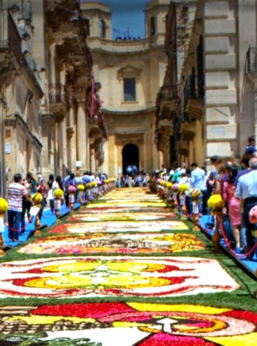 La manifestazione dell’Infiorata è nata nel 1980 in via Corrado Nicolaci è la via che fa da cornice all’Infiorata, l’impatto è forte, in alto la Chiesa di Montevergini che si contrappone al palazzo del Principe Nicolaci Villa Dorata, con i balconi che sono stati definiti i più belli del mondo. La strada, lunga 122 metri e larga 7 metri circa, viene infiorata in tutta la sua lunghezza, e, in larghezza, per 6 metri. Il tappeto copre un’area di 700 mq ed è composto da 16 bozzetti. Cortili, chiostri e vie cittadine sono abbelliti con riquadri, realizzati con creatività e capacità dagli artisti che propongono, di anno in anno, motivi diversi: religiosi, mitologici, e di cultura popolare. Nella preparazione dell’infiorata di Noto, che è considerata tra le più belle manifestazioni dell’intera Isola, si distinguono vari momenti: la riproduzione dei bozzetti, l’esecuzione delle sagome che vengono tracciate sul tratto stradale e l’allestimento da parte dei Maestri Infioratori che, insieme con i loro collaboratori, tappezzano di fiori i disegni già tracciati, sul lastricato di Via Nicolaci. Il lavoro di infioratura dei riquadri dura tutta la notte e l’indomani il tappeto floreale è pronto per stupire migliaia di visitatori italiani e stranieri, fino a tramonto inoltrato. La sera il via a spettacoli e iniziative collaterali, avvenimenti culturali di ogni genere, tra cui mostre, esposizioni, degustazioni, itinerari nel centro storico e nel territorio, musei e chiese aperte.