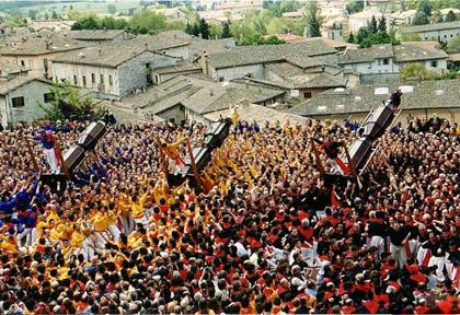 Parlare della storia della Festa dei Ceri non è facile. È tra le più antiche, se non in assoluto la più remota, manifestazione folcloristica italiana. La Festa ebbe ed ha tuttora un ruolo fondamentale per la comunità eugubina. Lasciamo il compito agli studiosi di approfondire la ricerca sulle origini e sui significati della festa. Sono due le ipotesi essenziali sulla sua nascita: una religiosa e l’altra pagana. La prima ipotesi, largamente documentata, presenta la Festa come solenne atto ispirato a devozione degli eugubini al loro Vescovo Ubaldo Baldassini, dal maggio 1160, anno della sua morte. Da allora, ogni 15 maggio, giorno della vigilia del lutto, l’offerta devozionale al Santo Patrono divenne un appuntamento fisso per il popolo eugubino, che avrebbe partecipato, in mistica processione, ad una grande “Luminaria” di candelotti di cera, percorrendo le vie della città fino al Monte Ingino (dove dall’11 settembre 1194 riposa il corpo di S. Ubaldo nell’omonima Basilica). I candelotti di cera, offerti dalle corporazioni di Arti e Mestieri, probabilmente divennero nel tempo tanto consistenti da renderne difficoltoso il trasporto e furono sostituiti verso la fine del ‘500 con tre strutture di legno, agili e moderne, che – più volte ricostruite – sono, nella loro forma originaria, arrivate fino ai nostri giorni. Sono rimasti invariati nel tempo anche la data e quasi la totalità del percorso della festa. La seconda ipotesi, poco documentata, propende per la rievocazione antichissima della festa pagana in onore di Cerere, dea delle messi, arrivando a noi attraverso le glorie comunali e le signorie rinascimentali, il dominio pontificio e le lotte risorgimentali. I Ceri sono Sono tre strutture di legno, formate da due prismi ottagonali sovrapposti e rinforzati da un telaio interno anch’esso di legno e attraversati da un asse. Questo fuoriesce all’esterno con due “timicchioni”. Quello in basso s’incastra su un supporto chiamato “barella” che ne consente il trasporto a spalla. Quello in alto permette di fissare sulle sommità tre piccole Statue che rappresentano i Santi Protettori delle Corporazioni: S. Ubaldo (patrono e protettore della città) per i muratori, S. Giorgio per i commercianti e S. Antonio per i contadini. Queste tre parti vengono assemblate insieme in occasione della Festa del 15 maggio. Durante l’anno Ceri e barelle sono custoditi nella Basilica di Sant’Ubaldo in cima al monte Ingino, mentre le statuette dei Santi sono conservate nella Chiesetta di S. Francesco della Pace detta “dei Muratori” in Via Savelli. Argeo Nuti, scultore dei Santi. Non ci sono documenti iconografici dei Ceri anteriori all’Ottocento, ma già allora avevano forme simili a quelle attuali. La parte visibile del Cero è costituita da tavolette in abete, fissate su una struttura centrale di olmo, mentre altre parti sono in faggio e in quercia. Ogni Cero ha una forma che si potrebbe definire a clessidra, con una strozzatura centrale e tre anelli o panottoli trasversali. Altri elementi del Cero sono le “manicchie”, stanghe di legno posizionate in coppia ai lati. I Ceri vengono decorati la sera prima della Festa con bandierine dorate a coda di rondine nella parte superiore e nappe anch’esse dorate, nella parte inferiore, staccate dai ceraioli la mattina dell’alzata del 15 maggio e conservate come ricordo. Le “barelle” che sorreggono il Cero e ne consentono il trasporto a spalla durante la corsa, sono a forma di “H” maiuscola, costituite da due stanghe di legno parallele unite tra loro da un tavolone sempre di legno detto “barelone” su cui si incastra il Cero. Le parti libere della stanga sono chiamate anch’esse “manicchie”, termine usato oggi anche per indicare i gruppi di ceraioli che si alternano sotto il Cero, scelti tra amici e parenti dalle varie zone in cui è suddiviso il territorio dei ceraioli.